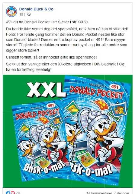 Yesterday we got a little surprise in the comic racks in Norwegian stores. The new issue of the long running Donald Pocket series suddenly was on sale in two different sizes! This came out of the blue with no previous announcement, but we got a short (not very informative) message on the publisher's Facebook page the same day.
